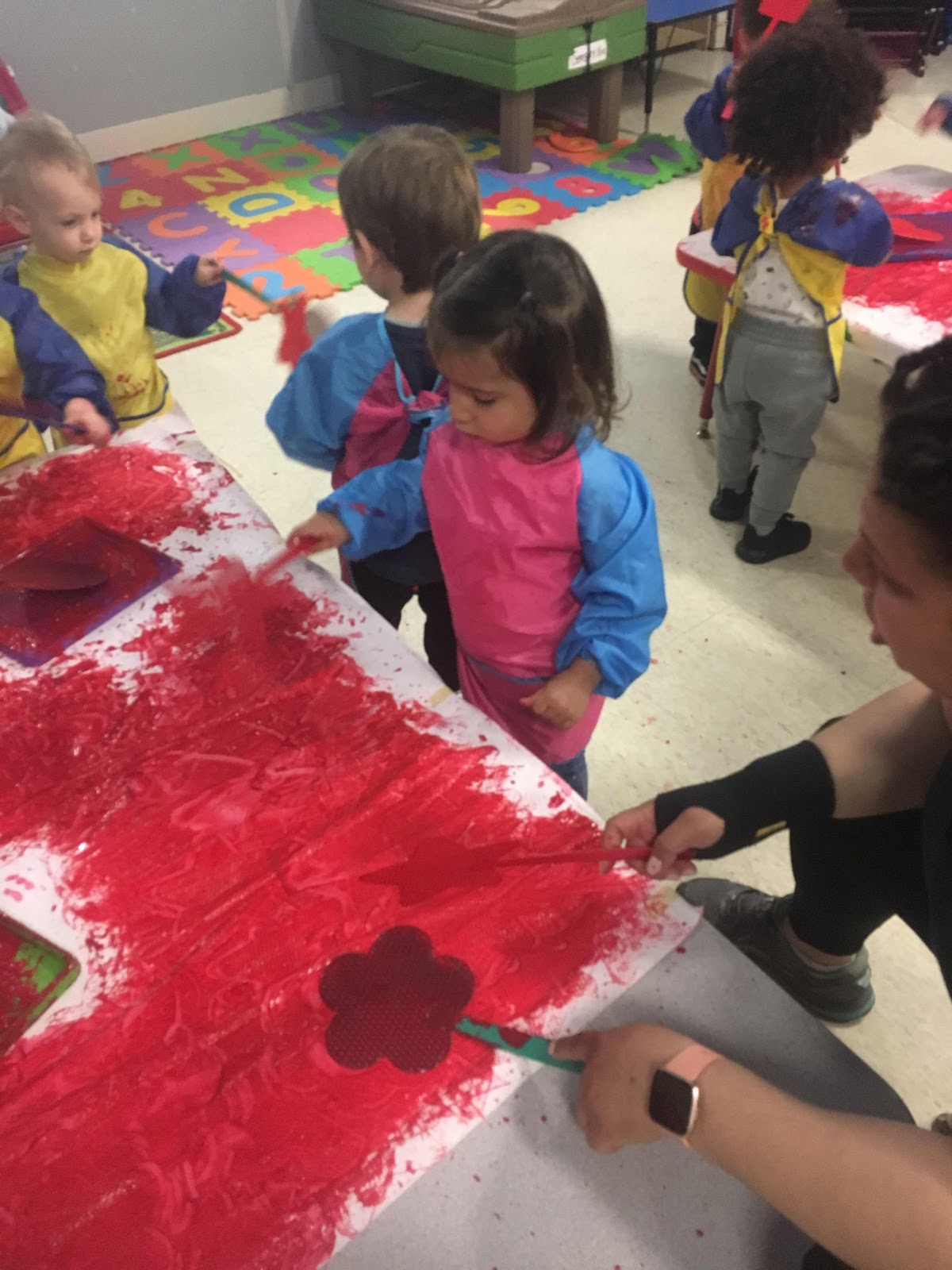 Today we painted with fly swatters! We read one of our favorite books “Shoo Fly” and we learned that we use swatters to shoo flies that we see. We took to the table and started to pretend to shoo the fly! They had a blast and got very messy!